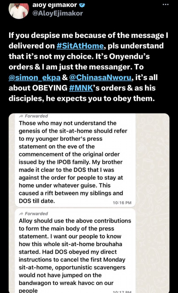 “If you despise me because of the message I delivered on #SitAtHome, please, understand that it’s not my choice. It’s Onyendu’s orders, and I am just the messenger.