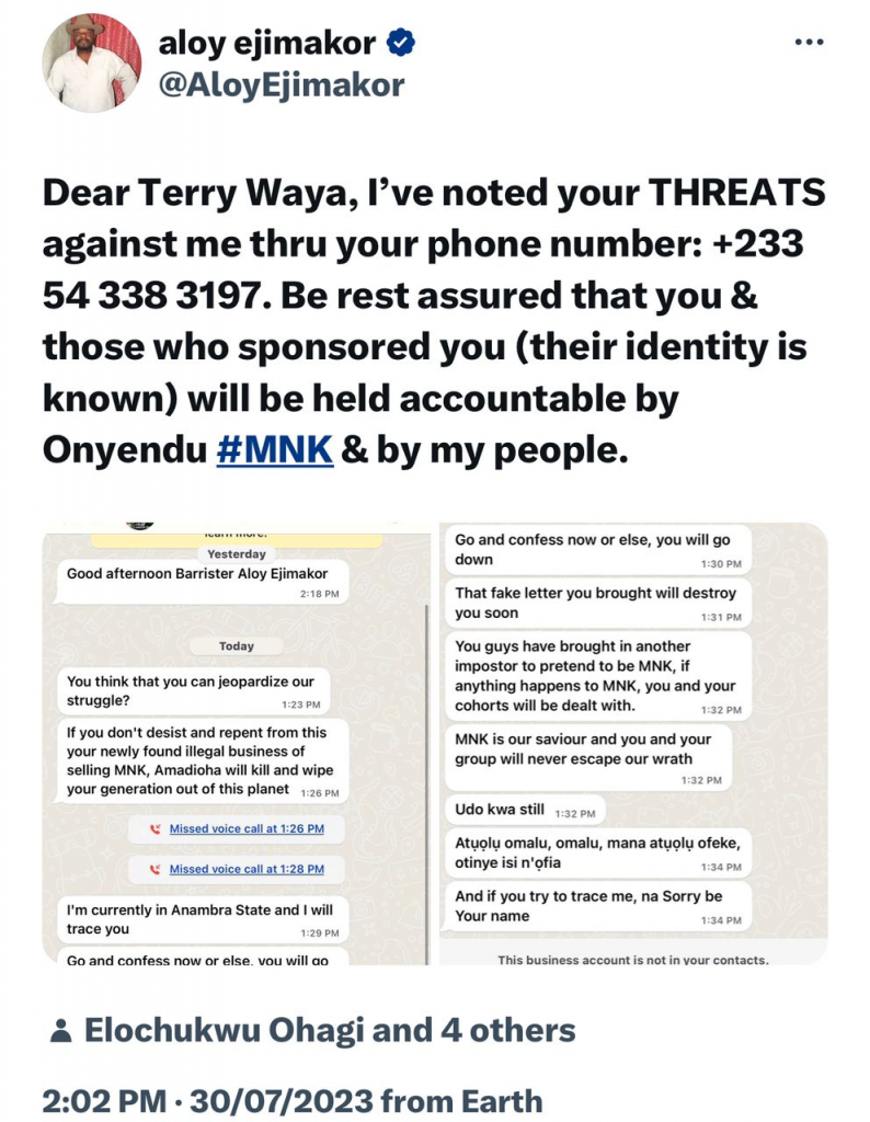 “Be rest assured that you and those who sponsored you (their identity is known) will be held accountable by Onyendu #MNK & by my people. The threat to my life by Terry Waya and his master(s) is becoming more potent. He now says that he knows my house.