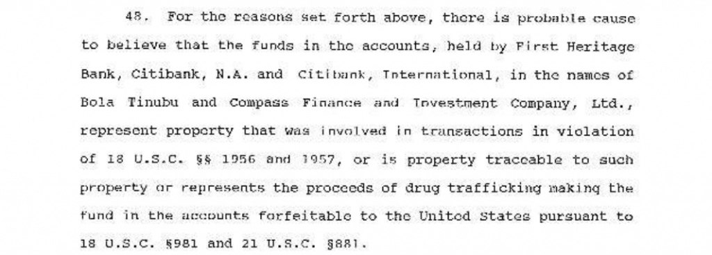 A 1993 report by IRS Special Agent Kevin Moss explained that “there is probable cause to believe that funds in certain bank accounts controlled by Bola Tinubu… represent proceeds of drug trafficking; therefore these funds are forfeitable to the United States.”