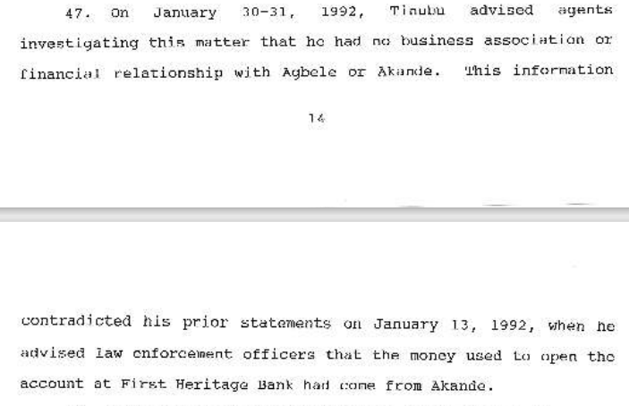 But in late January of 1992, “Tinubu advised agents investigating this matter that he had no business association or financial relationship with Abele or Akande,” Moss wrote. “This information contradicted his prior statements on January 13, 1992, when he advised law enforcement officers that the money used to open the account at First Heritage Bank had come from Akande.”